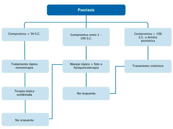 • Tratamientos tópicos: se aplican sobre las placas, este tratamiento es usado cuando las placas no son muy extensas, es decir que ocupan menos del 10% de la superficie corporal. Ejemplo de estos tratamientos son: (corticoesteroides, antralina, vitamina D y sus análogos, retinoides, productos de alquitrán, ácido salicílico).