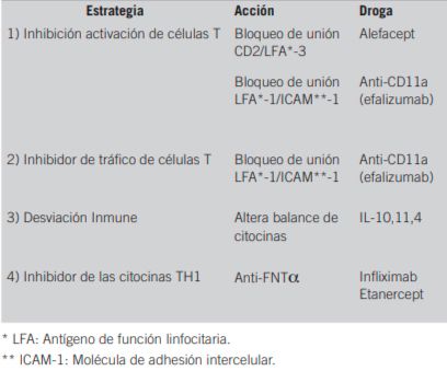 Imagen 3: Estrategias de inmunosupresión probadas en psoriasis. Echeverri Montaño et al. Nuevos avances de la terapia biológica en la psoriasis. 2005. Link: https://www.medigraphic.com/pdfs/cutanea/mc-2005/mc051b.pdf